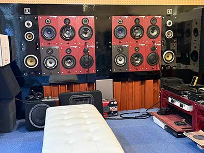 試聴室の左側面にはさらに7機種。こちらはメーカーの上位モデルなどをおいています。