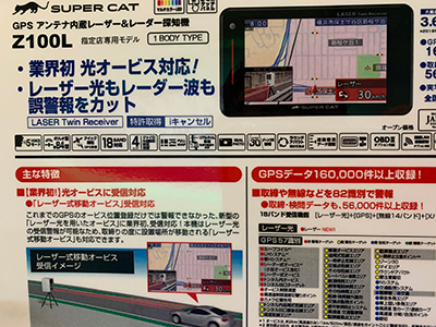Z100L。最近、ぼちぼち設置され始めた光オービスに対応したレーダー探知機。現在設置されている取締機が耐用年数を超えて、だんだんと新型に切り替わっていくそうです。新しいレーダーはレーザー光タイプなので従来の探知機では検出できないそうです。