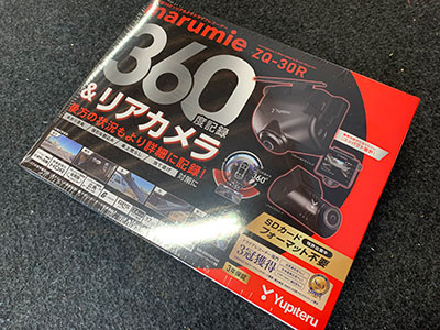ドラレコを追加いただきました。最近は360°モデルが定番になりました。リアカメラもセットになったZQ-30R。液晶モニター付きが人気です。こちらはSDカードのフォーマットが不要ですので楽です。