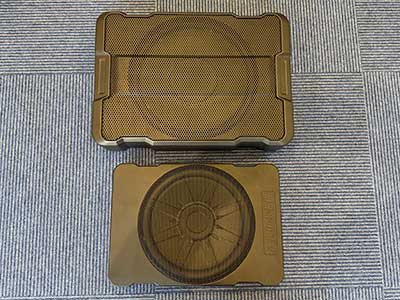 従来のKICKERの【HS10】が右で、これは25cmウーハーが入っていて、薄いのにまるでシッカリ容量が足りた箱に入っているかのような鳴りっぷりで人気です。左はカロッツェリアのTS-WH1000Aで、こちらは薄いからなのかわりと皆さんサイズが小さめと思っている方が多いもので、実は
