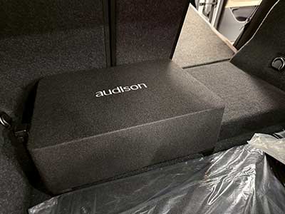 シート下の純正ウーハーでは再生できないローエンドはイタリアのAUDISONのパワードウーハーAPBX10AS2。