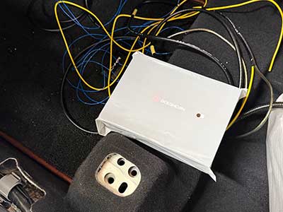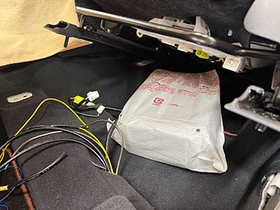 助手席下に収まります。このパワードウーハーは高さが10cmあって、シート下には収まらない車が多いです。箱の容量が小さめのパワードウーハーはできるだけシート下への取り付けが理想です。