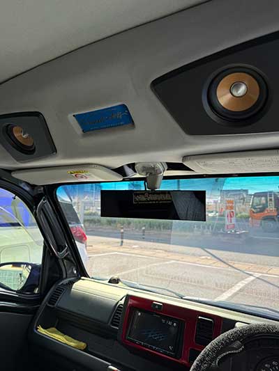ダッシュにツィーター、シート後ろにパワードウーハー。カロッツェリアの2DINヘッドの内蔵DSPで調整していますが、ほんとにこの車いい音がします。天井のスピーカーなんて、近い方は50cmないんじゃないかというくらいの距離ですが、全くスピーカーの存在を感じません。ドアスピーカーの取付をやめて天井を思いついたのはなかなかのアイデアでした。もちろんジャンボだからできた技ではありますが。