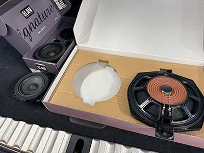 以前、フロントスピーカーとシート下のウーハーをBLAMに交換させていただいていました。次のお車がBMW MINIですので載せ替えが可能です。