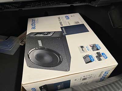 ウーハーはトランクへ、当店人気のパワードウーハーイタリア製AUDISONのAPBX10AS2。よく鳴ってくれるし、デザインもシンプルでいいので人気です。
