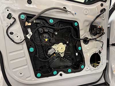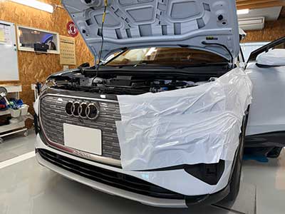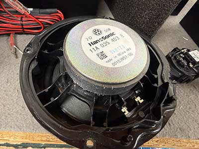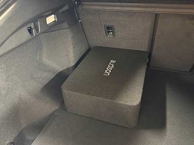 こちらはアウディのQ4。当店では初入庫の車種です。スピーカー交換スタンダードラインパッケージで、フロントスピーカーの交換とお手軽低音増強セットでパワードウーハーの取り付け。