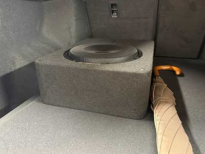 ウーハーを上向きにしてみました。参考に横に傘を置いてみましたが、結構高さがあります。ただ、このチャコールのカーペット生地もトランクにはよく馴染みます。