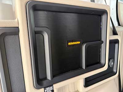 この正面にGOLDHORNのDSP。デモカーなのでPCSをつなぐ頻度が多いのでケーブル類を引き出しています。