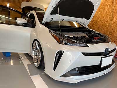 常連様のプリウスが入庫。こちらのお客様はもう20年以上に渡って当店をご利用いただいている超常連様。いつも外装内装ともビシッと作り上げていて、オーディオもアウターバッフル、トランクカスタムと見せる要素をきちっと抑えつつ、音質にもこだわるという毎回力の入った一台を作り上げていただいています。