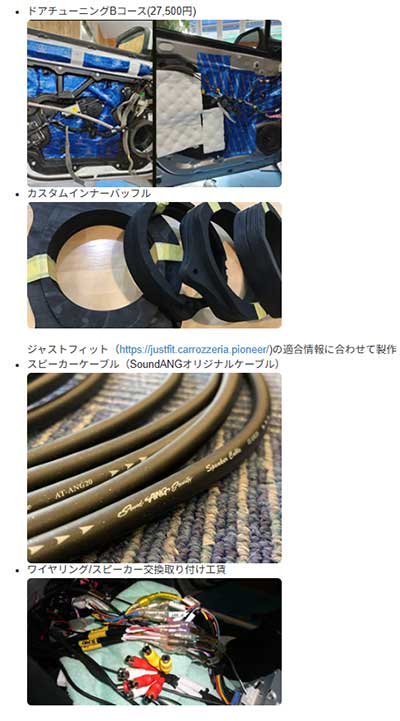 スピーカー代金と、ドアチューニングBコース、カスタムインナーバッフル、スピーカーケーブル、ワイヤリング工賃が含まれます。