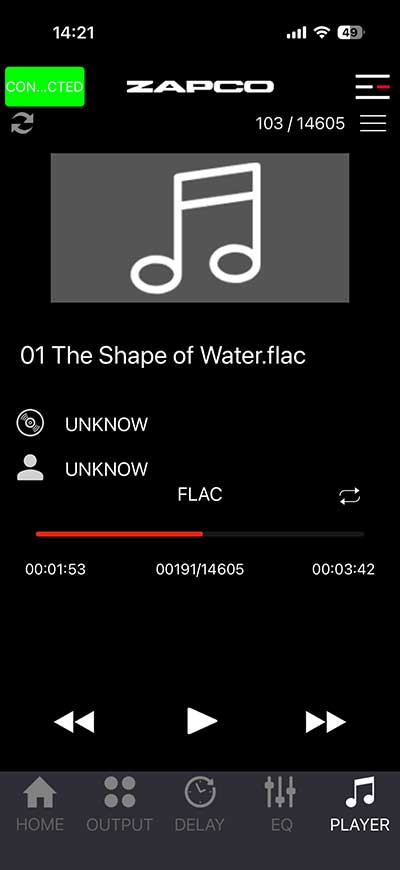こちらはメディアプレーヤーの画面。曲が多いと読み込みに時間がかかります。この価格帯のDSPに付属してくる機能としてはとてもお買い得だと思います。ただ、それなりに使い勝手は慣れが必要かなと思いました。そもそも、USB-DAC機能やブルートゥースもあるので、幅広いソースを使えるのがこのモデルの魅力ですね。音も、試聴室で聴く限り素直で良さそうです。